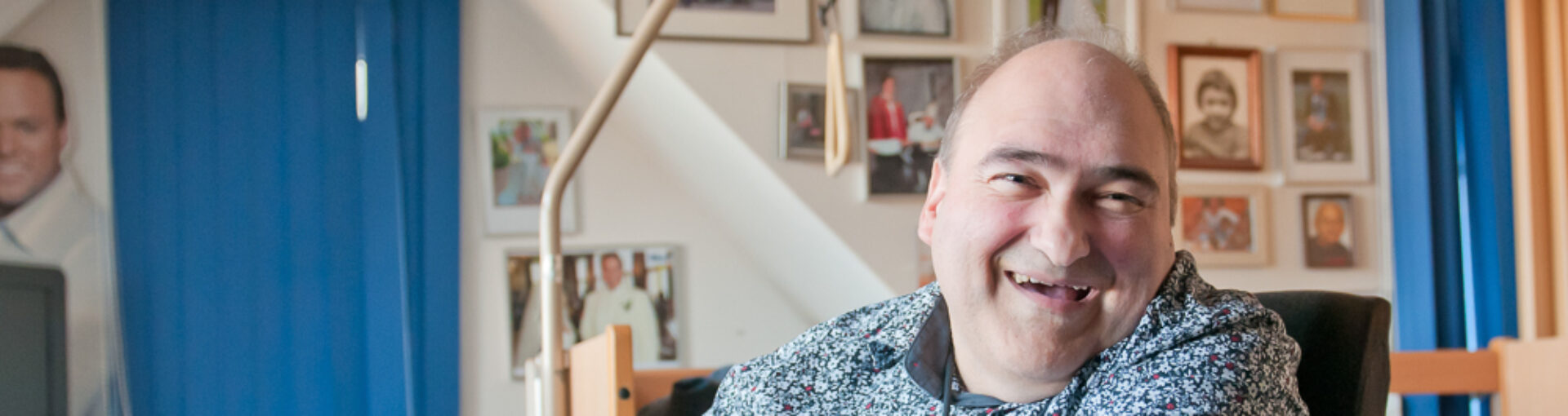 “Het was moeilijk om thuis weg te gaan, maar omdat ik veel verzorging nodig heb ging het niet anders. Ik woon graag in het WBC. Ik heb leuke medebewoners en we gaan zo veel mogelijk op stap, naar het dorp, een feest of op uitstapje. Ik heb een mooie kamer waar ik me thuis voel en lekker muziek kan draaien.”
